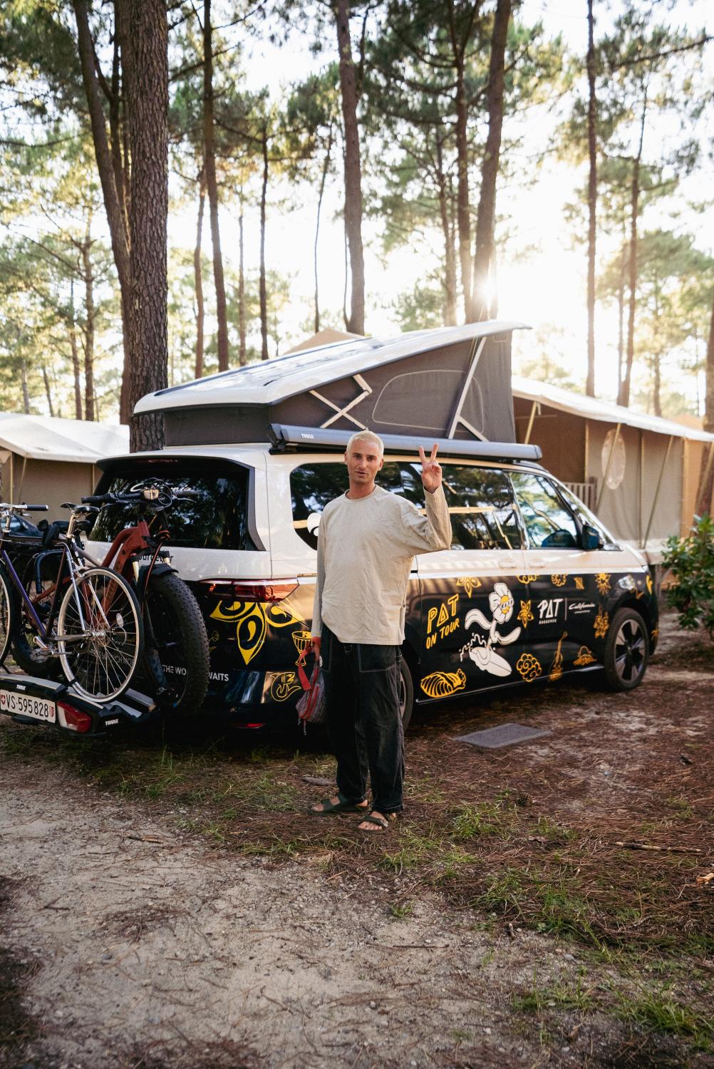 Même dans la vraie vie, le Romand et le California s’accordent parfaitement, car personne ne vit la vie vanlife de manière aussi cohérente que Pat Burgener. Volkswagen Véhicules Utilitaires Suisse a récemment pu lui remettre son nouveau véhicule de fonction, un California Ocean. Il lui sert d’appartement mobile. En effet, il a abandonné ses quatre murs fixes. Que ce soit pour faire du surf sur les plages de l’Atlantique au Portugal ou du snowboard dans les Alpes suisses, son nouveau camping-car l’accompagne désormais partout.